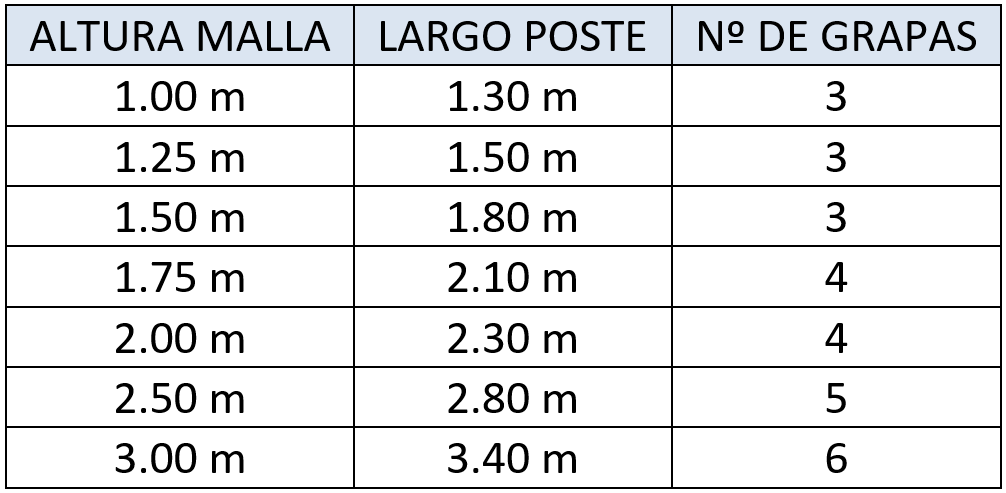 Se ofrece en distintos largos dependiendo de la altura de la malla y existe la opción de incrementar la medida, en recto o curvado, para la colocación de alambres de espino en los extremos superiores del cerramiento.